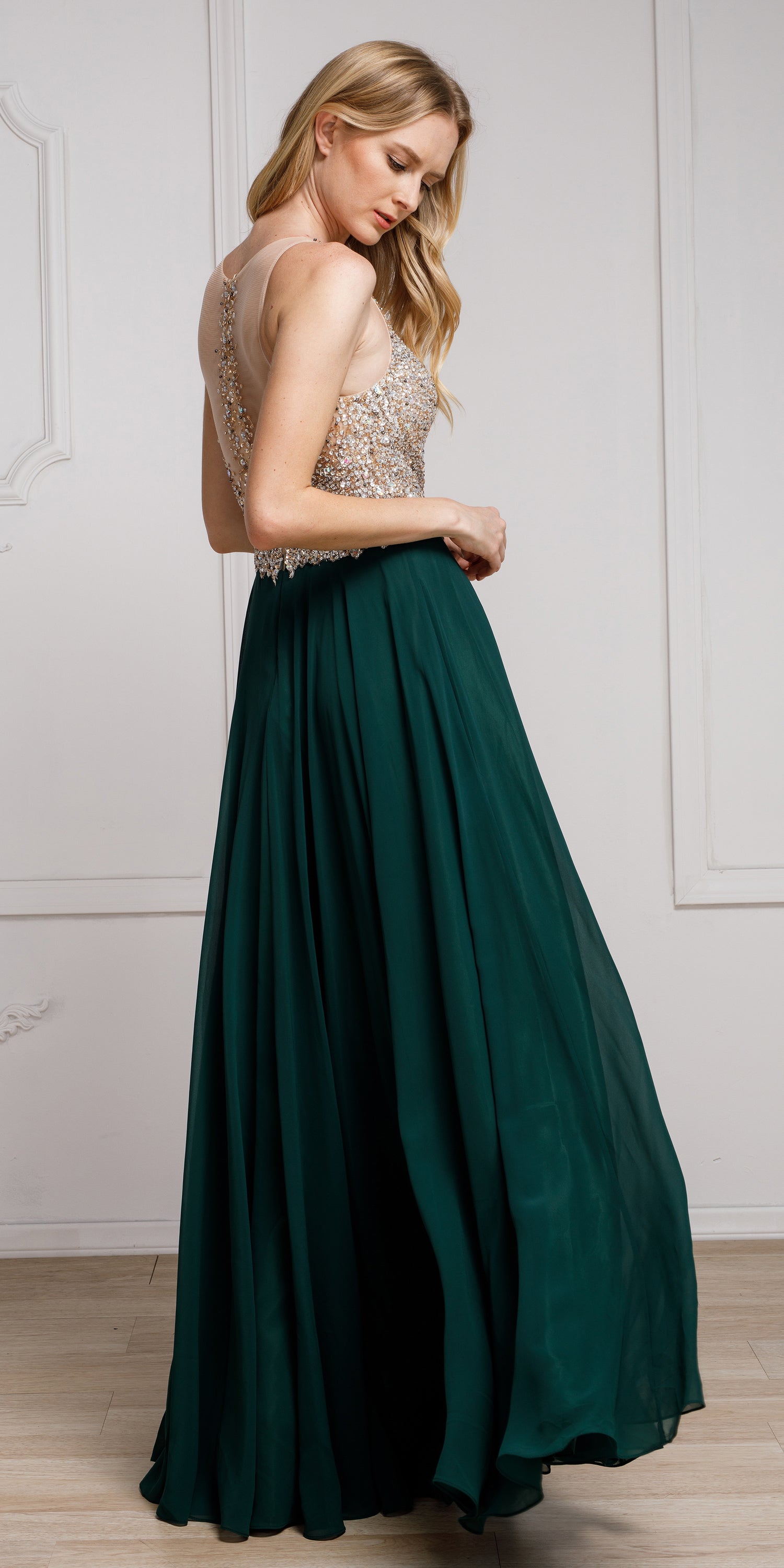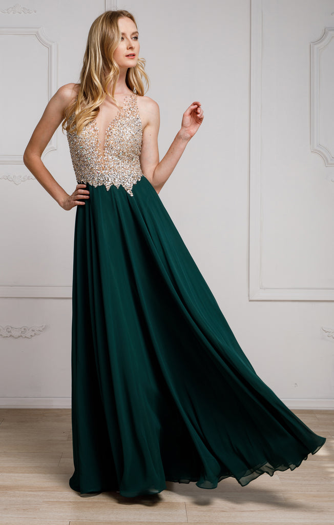 Sequined prom dress with a free flowing skirt. Features fitted bodice and a back zipper closure.