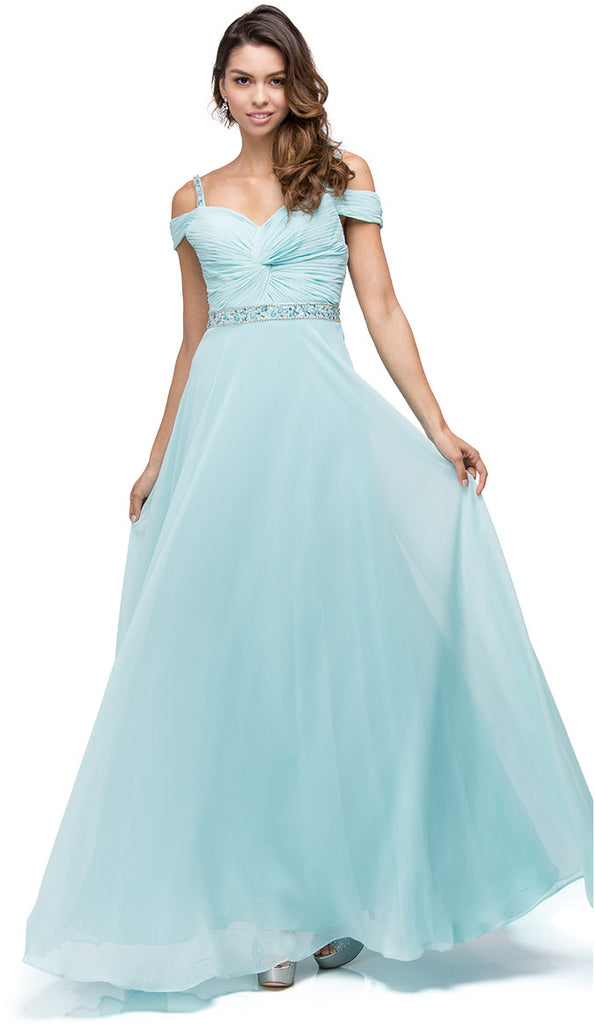 Cold Shoulder Beaded Waist Long Bridesmaid Prom Dress. Sweetheart neck bodice which is ruched and twisted & also has ruched off-the-shoulder sleeves that lay gently over the arms. Beaded shoulder straps providing style and support with shimmering sequins encircling the waist. Corset back laces up for a classic style on this 60" long polyester chiffon dress. Imported.
