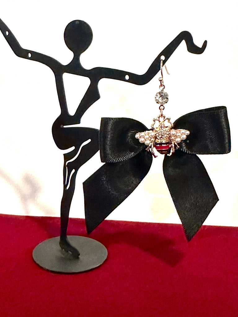 Designer Black Bowtie Bee Earrings Featuring Pearl Detailing