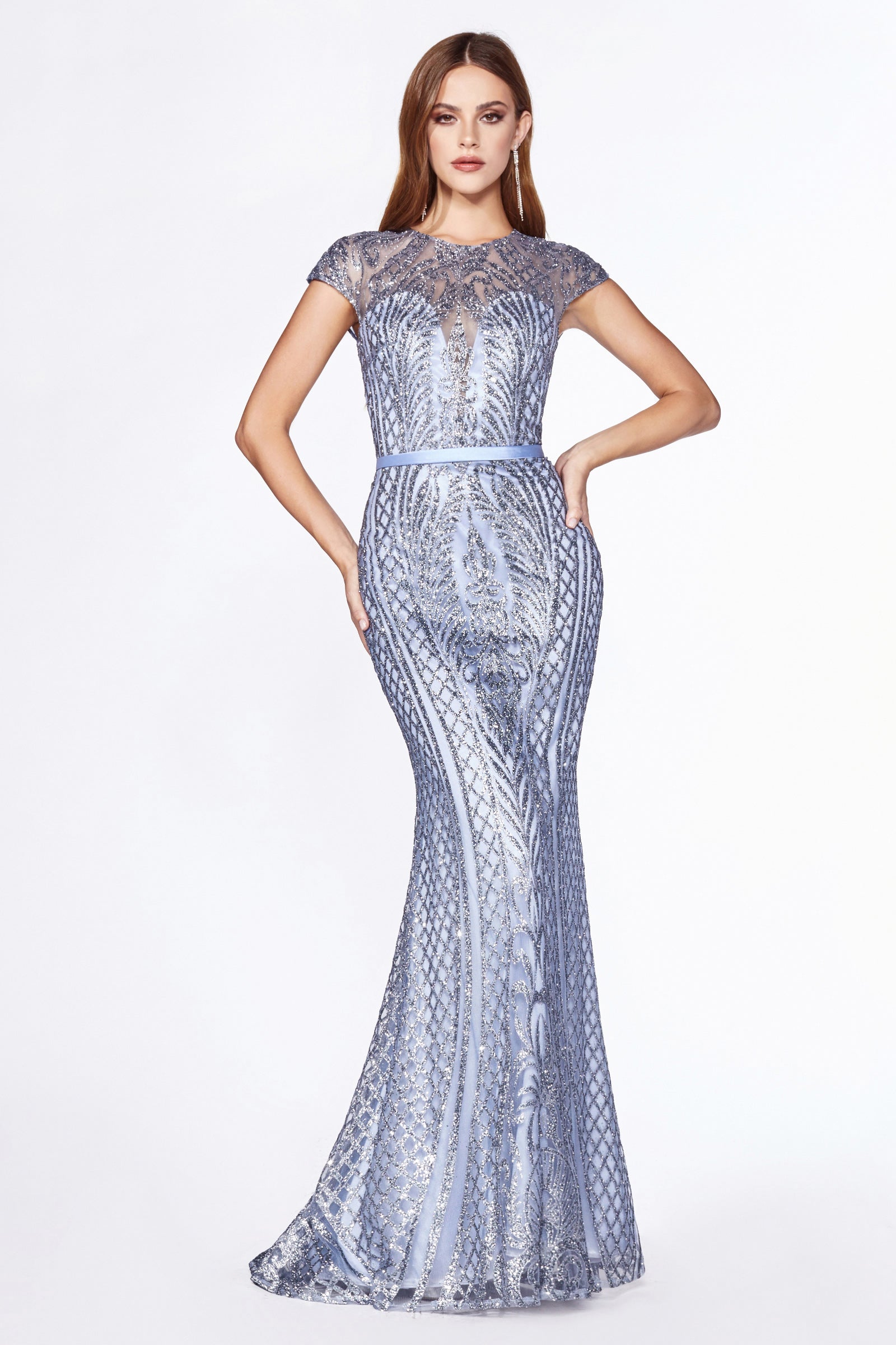 Gorgeous glittering fitted lattice print gown with cap sleeves and closed back. Available in two amazing colors: Rose Gold & Smokey Blue.
