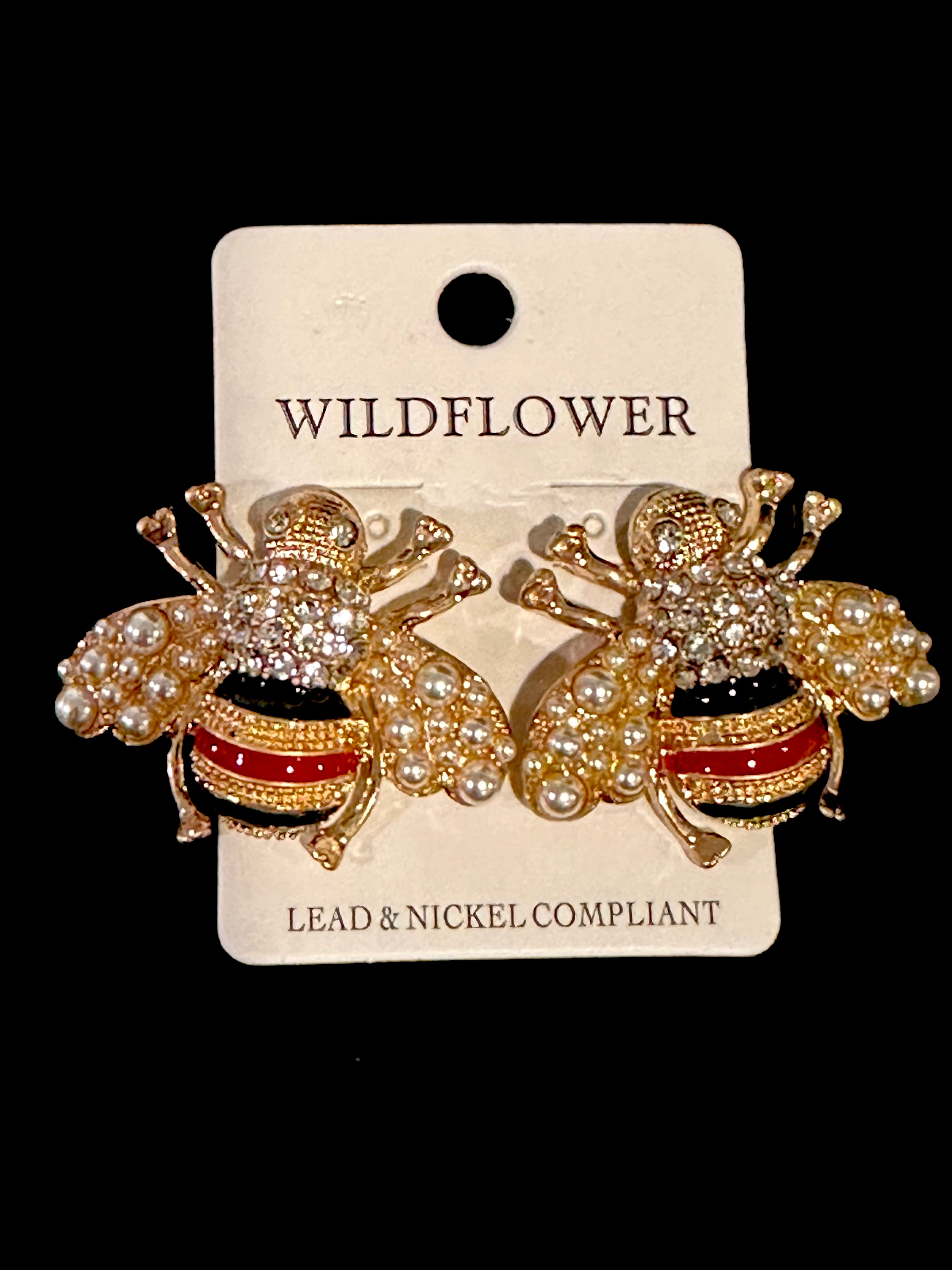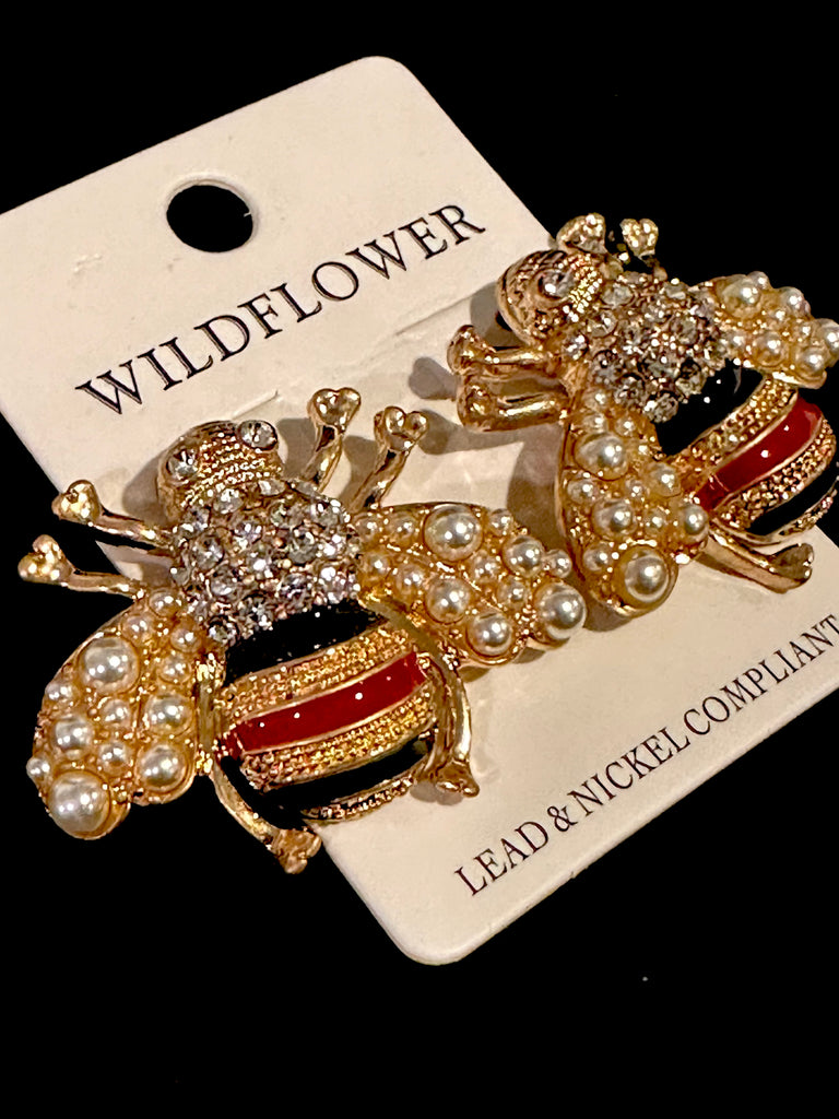 Stunning Large Rhinestone and Pearl Accented Bee Earrings.