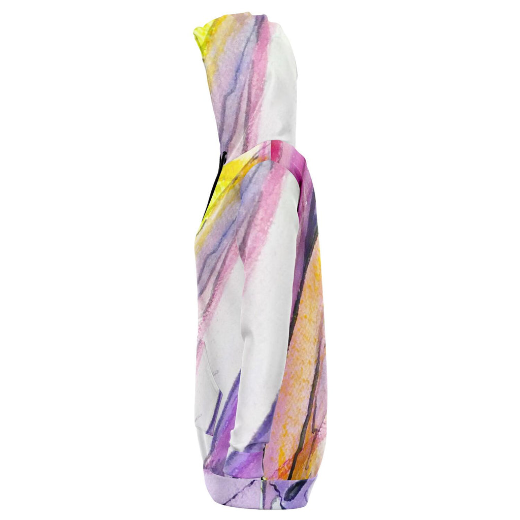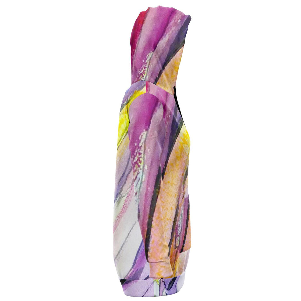 This longline hoodie with the Sunflower Print by Heather French Henry is made from a soft cotton and polyester faced fabric with a nice brushed fleece on the inside. Fitted with a feminine shaped silhouette for ultimate comfort. Each panel is individually printed, cut and sewn to ensure a flawless graphic with no imperfections.